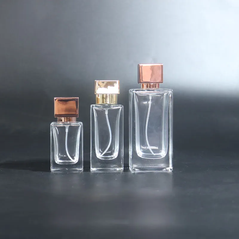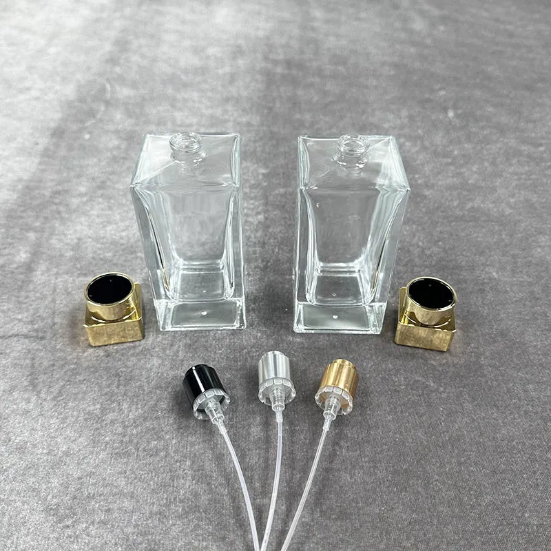 Cuadrado transparente Frasco de vidrio con boca engarzada para perfume con tapón pulverizador (30 ml / 50 ml / 100 ml) – Descripción general del producto